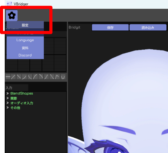 その後、Vbridgerの左上にある歯車マークを押して、「設定」を押します。