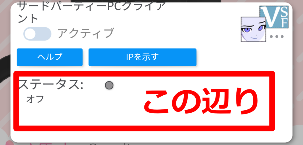 「IPを示す」ボタンを押して表示されるIP(v4の方で大丈夫です)をVBridgerの画面下部分に入れてください(「Vbridgerの画面」画像②の位置)。
